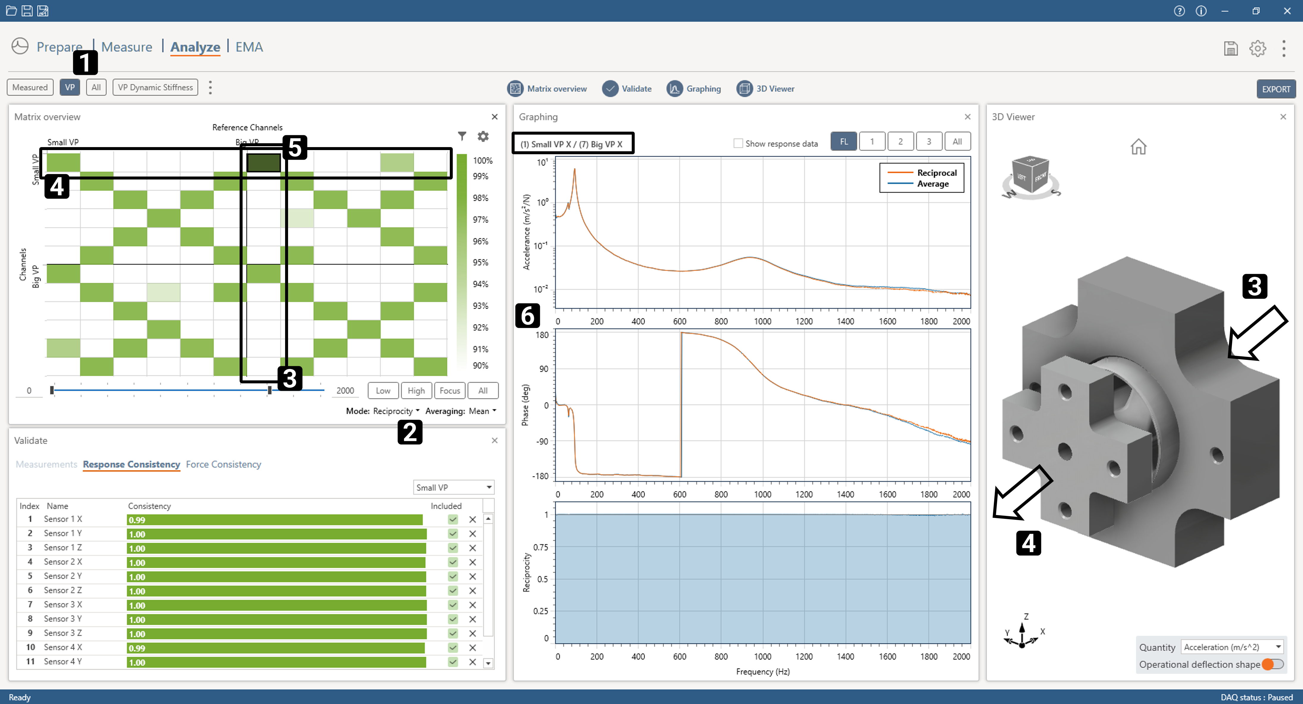 During the measurement process, to have a high-quality test-based model (link), check the plausibility of the VP transformed data after measuring each VP. It is very important that you do this quality check after ensuring that the data is free of overloads and when you are satisfied with the quality of the coherence and VP consistency. This is needed because VP data builds on good setup and signal quality.