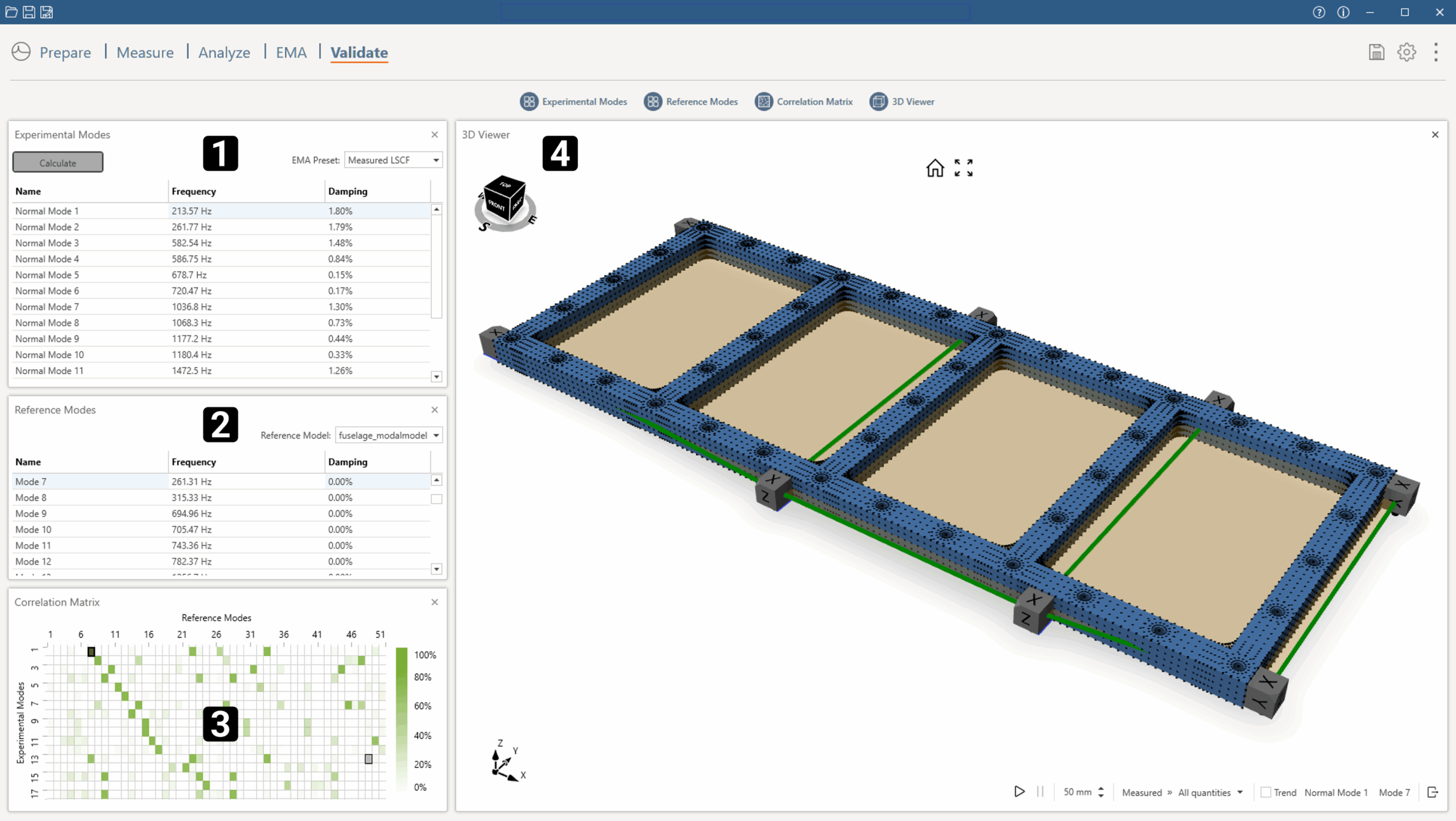 The Validate module allows you to perform a modal validation between your experimental and reference models, comparing experimentally obtained modes and numerical ones. To perform model validation, you need the dir-validate license.