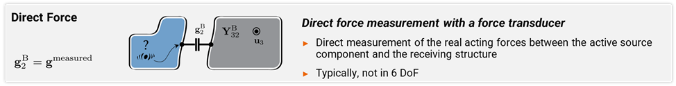 Both steps pose some challenges in practice. The FRFs of the passive side are typically determined from impact or shaker tests or in a reciprocal fashion using, for instance, an acoustic source at the receiving location and accelerometers at the interface nodes. Either way, it requires dismounting of the active part(s) from the passive side. Concerning the determination of $$ \mathbf{g}_{\mathrm{2}}^{\mathrm{B}} $$ operational interface forces, it could be impractical to mount force sensors between the active and passive part. Therefore, several indirect methods have been developed to circumvent direct force measurement.