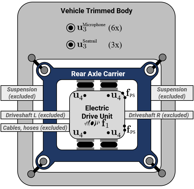Transfer paths from the EDU up to the targets in the cabin, i.e. sound pressure at the driver’s ear and vibrations at the seat rail, were obtained through Dynamic Substructuring of the individual subsystem models using the Lagrange Multiplier Frequency Based Substructuring (LM-FBS) method. Transfer paths from the rear wheel hubs up to the targets in the vehicle were obtained from FRF measurements. The individual subsystem models were obtained through measurements using the Virtual Point Transformation in DIRAC.