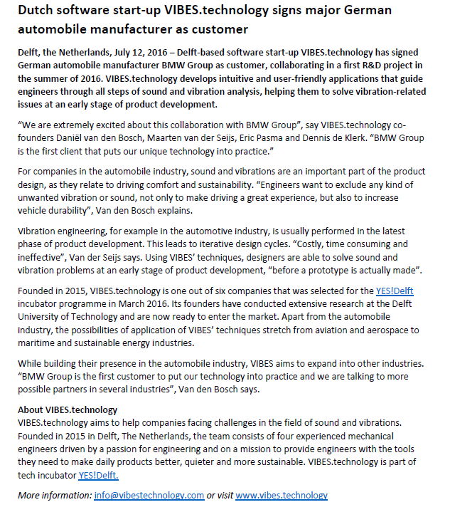 VIBES was founded on February 29th 2016 by a group of TU Delft alumni with academic and industrial experience in sound & vibration engineering. In the spring of 2016, VIBES joined the YES!Delft incubation program and moved into the YES!Delft building. Because VIBES was founded on a leap-day, we typically have some flexibility to make sure we can celebrate anniversaries on a working day 😊
