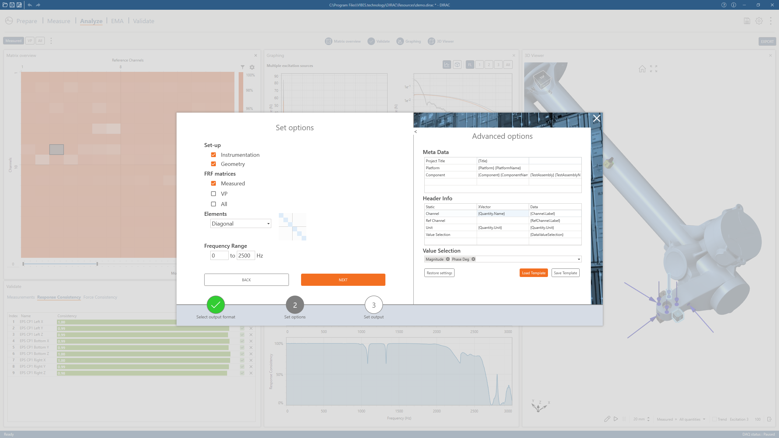 DIRAC ensures that validated measurement and analysis results can be seamlessly reused in downstream engineering workflows. FRFs, Virtual Point data, and derived results can be exported to widely used standardized formats such as Excel, HTMX, MATLAB, and UFF, making integration with existing analysis environments straightforward. In addition, DIRAC supports export to file formats that are native to VIBES’ SOURCE and COUPLE software products, enabling a smooth transition to source characterization, coupling, and system-level studies without data conversion or loss of traceability.