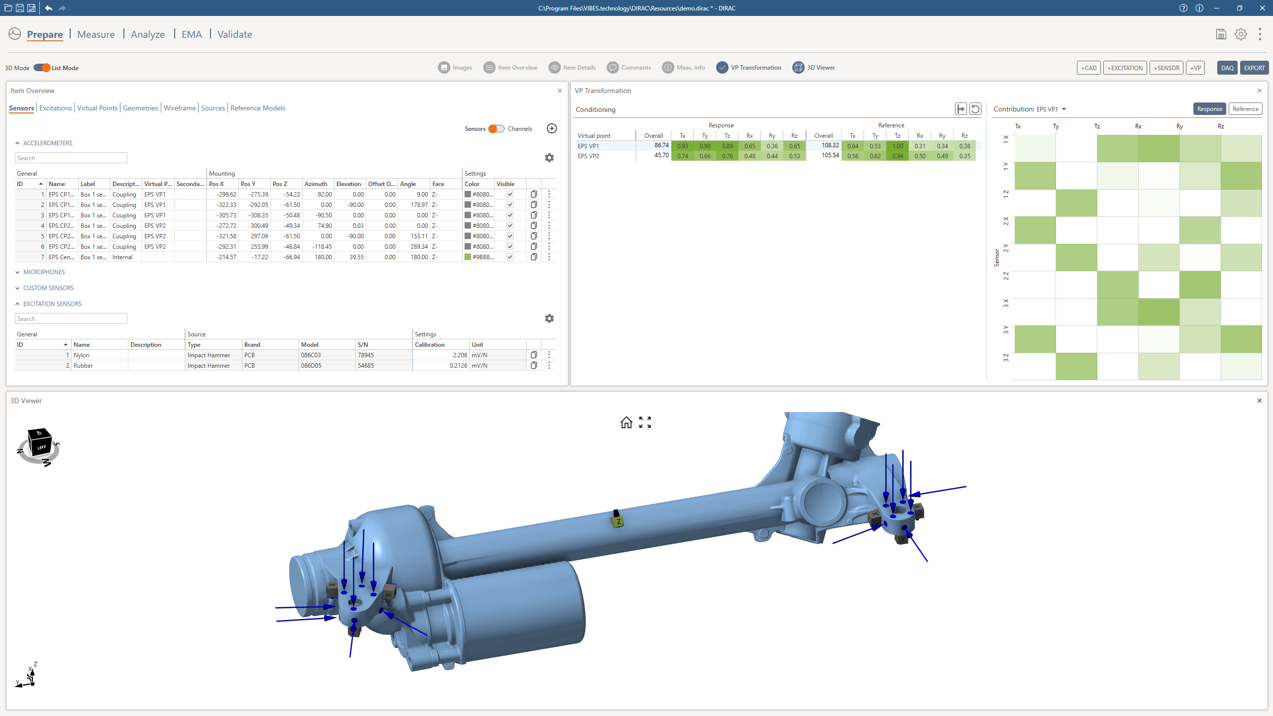 - Definition of sensors, impacts, shakers, and Virtual Points on the geometry