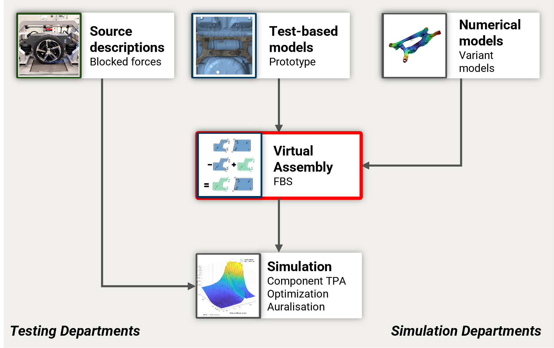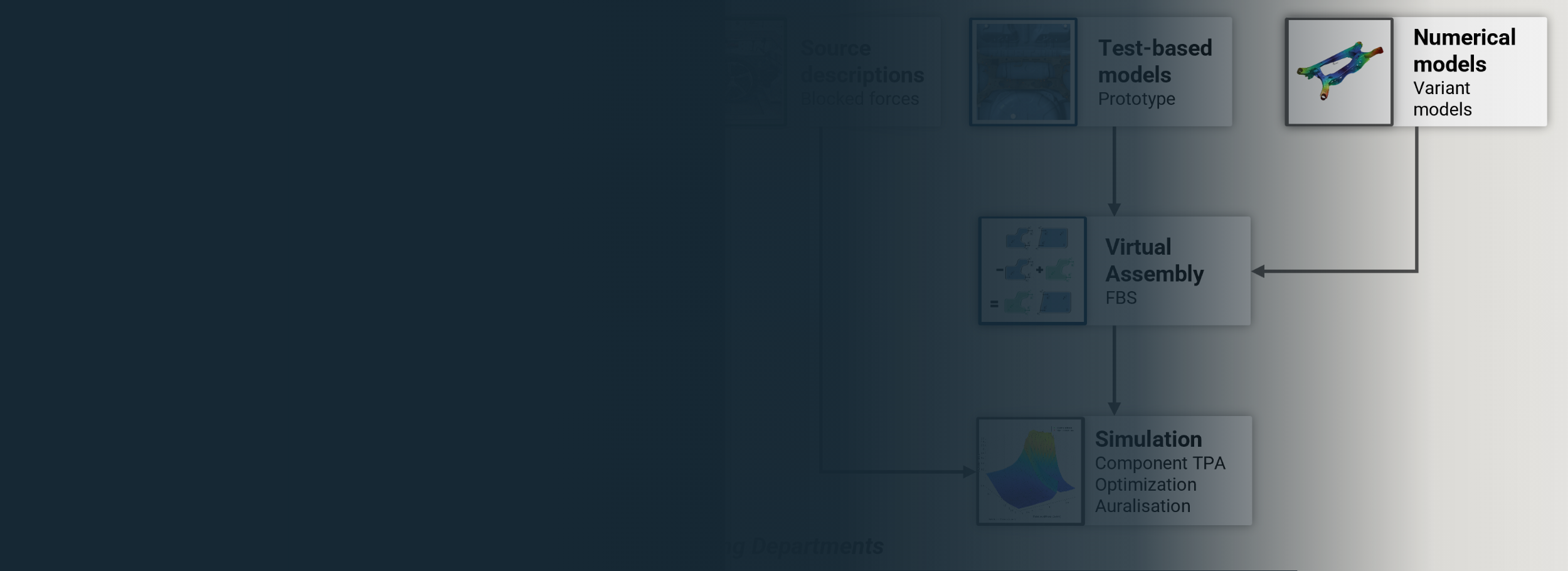 Hybrid Modular Modelling allows for modifying substructures (= parts, components and systems), by changing stiffness, damping, mass (distribution) and geometries. You can then assess the impact of these modifications on the noise & vibration behavior of any assembly of these substructures, such as your full product or a relevant part of it. The following workflows and software unlock the full potential of this solution.