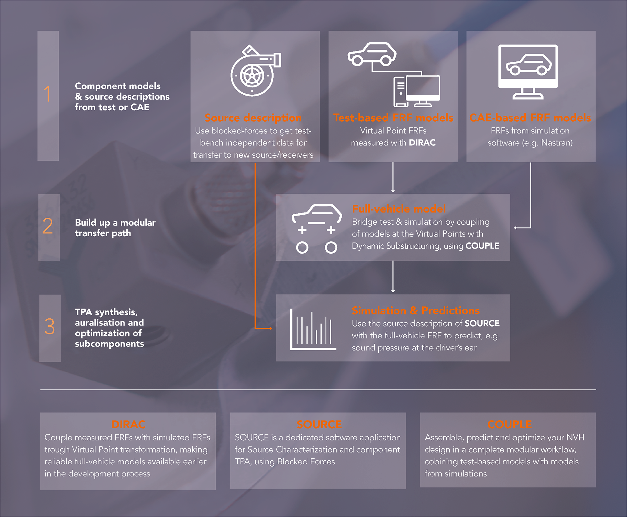 VIBES software users can break complex systems down into parts to for separate & accurate modelling: test-based models for complex parts, and numerical models for simple parts. This hybrid approach results in an assembly suitable for highly accurate NVH-analysis.
